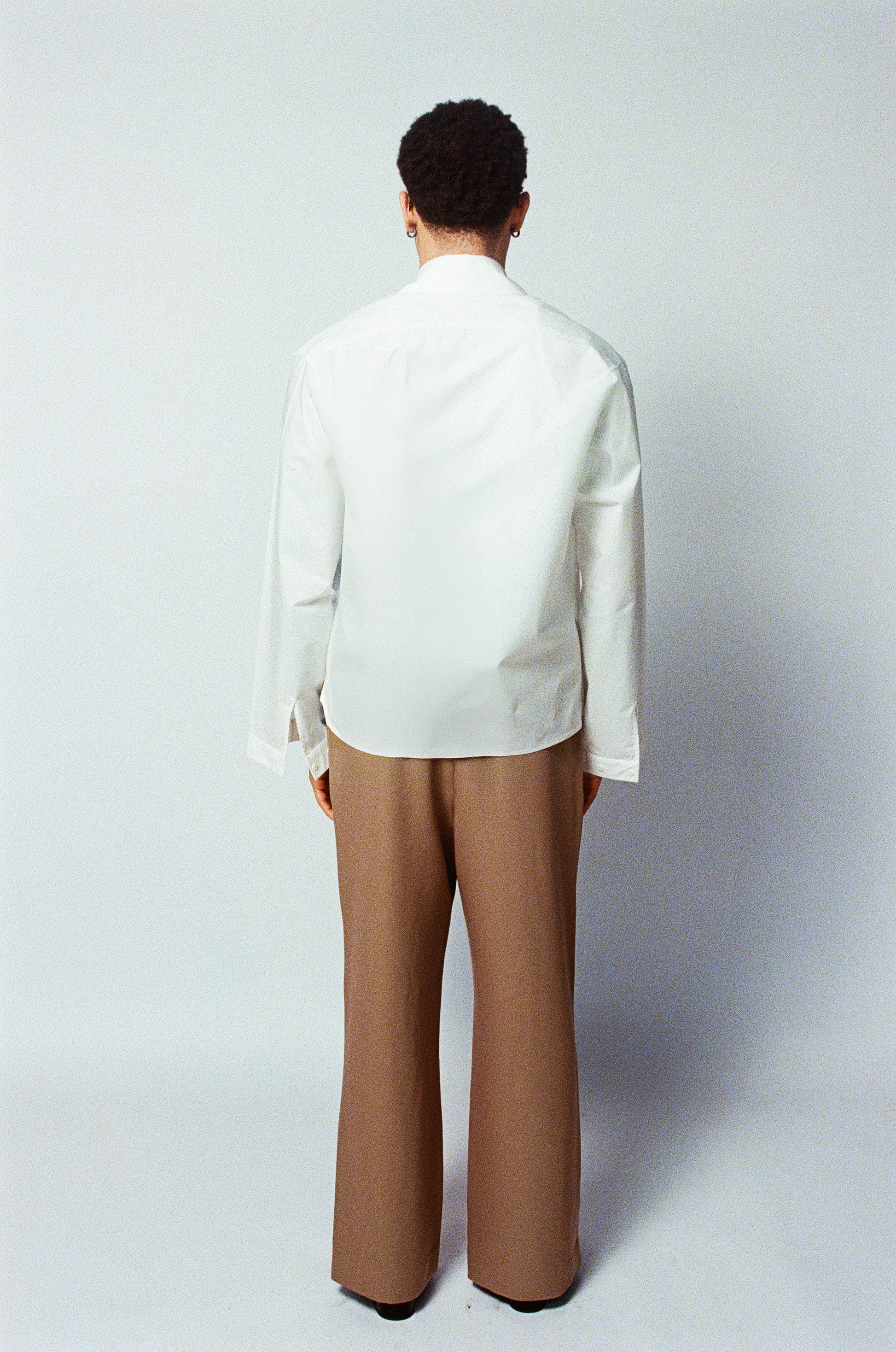 This shirt is inspired by Babban Riga, a style of robe originating from the Hausa communities in West Africa. This shirt features four overlapping panels referencing the layering and draping commonly seen while styling the robe.