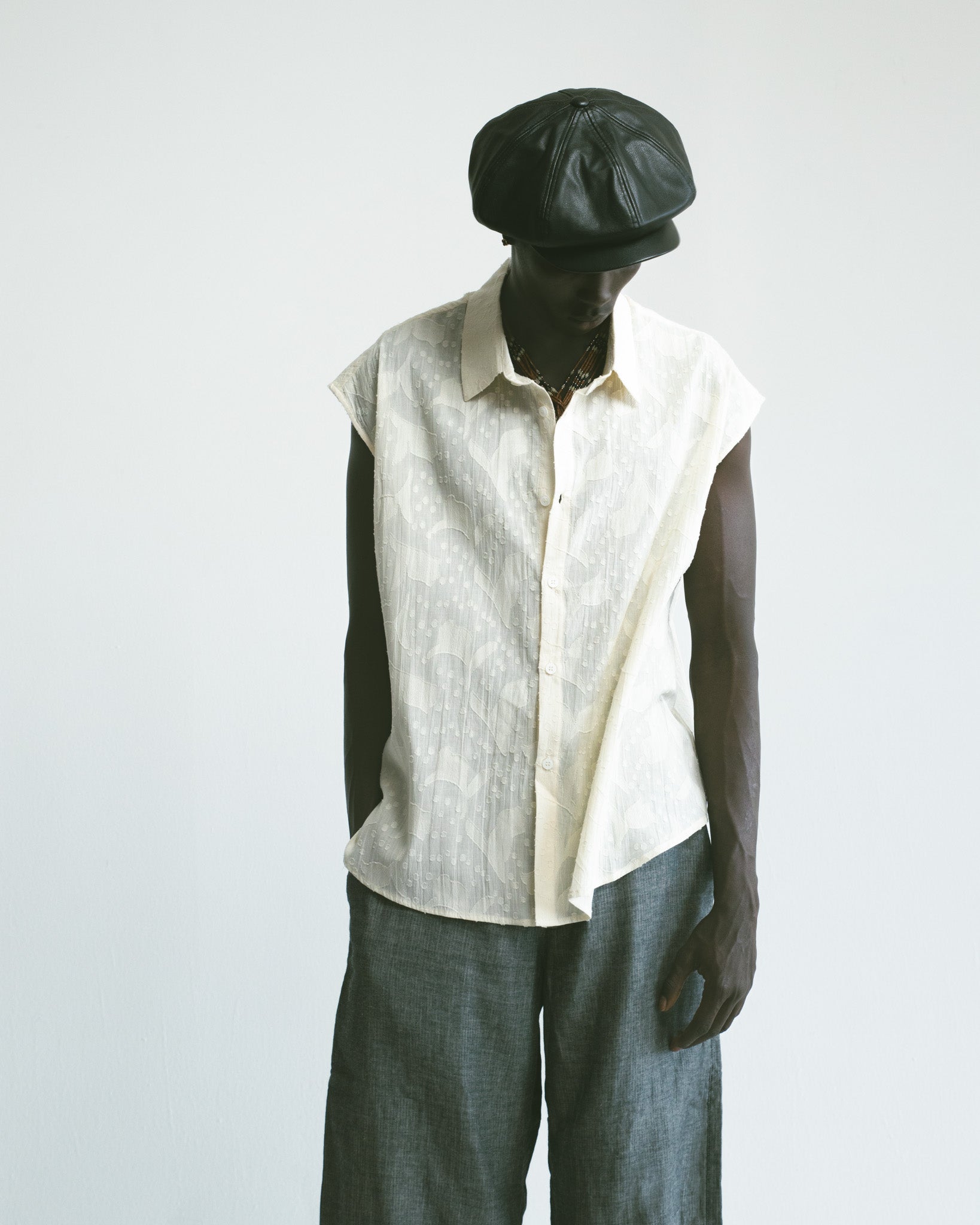Sleeveless button up shirt with intricate devoré style floral impressions.
